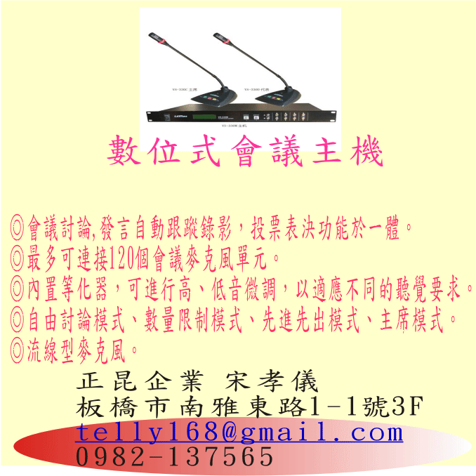 1.采數位信號單一電纜傳輸,連線會議單體采並接之方式。單一主機可連接30組以上會議單體並具多組會議輸出回路